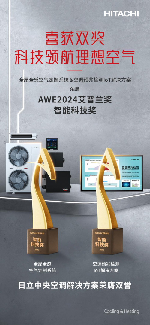 2024中國家電及消費電子博覽會(AWE2024)上,日立中央空調驚艷亮相,發布最炫空氣定制解決方案。他們的全新全屋全感空氣定制系統和超前的空調預兆檢測IoT解決方案,雙雙斬獲AWE2024艾普蘭“智能科技獎”。